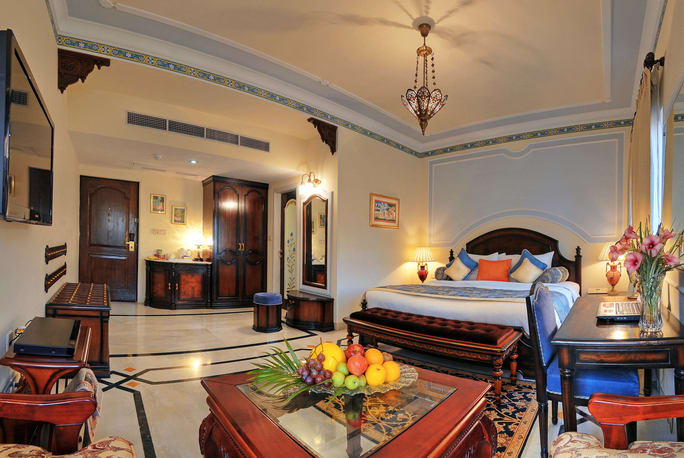 Deluxe Suite - Orient Taj promises to make your trip to Agra as memorable as you ever dreamt of. Get yourself indulged in the richness and exquisiteness of Mughal era through our 26 rooms (Deluxe Suite), ranging area of 1100 sq. ft. The impressive architecture and beautiful paintings and carvings on walls are breathtaking and remind you of the Mughal era. All our rooms are tastefully designed with rich designer upholstery and linen in matching color combinations. Each room is equipped with bedside control panel that manages numerous services and functions.