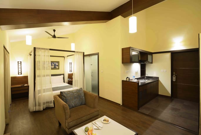 Executive suite - No Casino Hotel in Goa can be complete without an exquisite Executive Suite. Ours offers you a spectacular view of the serene village of Nerul alongside latest amenities. Each suite is equipped with a large drawing room, a bedroom furnished with an LCD TV, a mini bar, kitchenette and an adjoining balcony.
